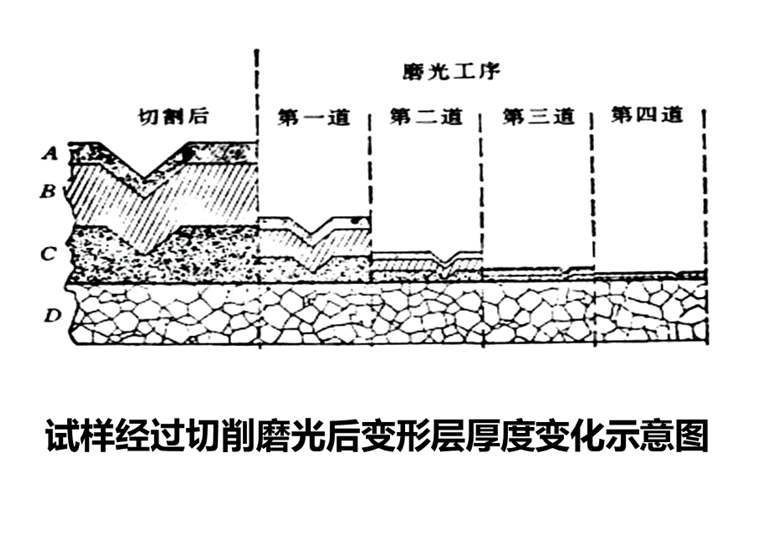 每一道磨光工序必須除去前一道工序造成的變形層(至少應使前一道工序產生的變形層減少到本道工序產生的變形層深度),而不是僅僅把前一道工序的磨痕除去;最后一道磨光工序產生的變形層深度應非常淺,保證能在下一道拋光工序中除去。