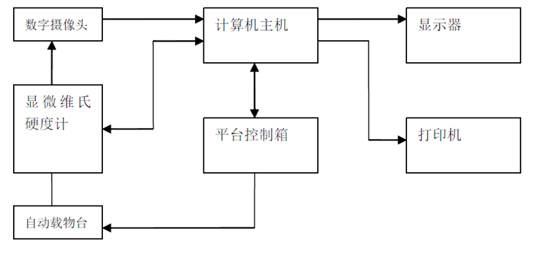 計算機主機通過 RS232 串口,控制硬度計的動作并接收硬度計的相應(yīng)信息;計算機主機通過 RS232 串口,控制平臺控制箱,并通過平臺控制箱,控制自動載物臺移動并接收相應(yīng)信息;維氏硬度計所壓的壓痕的光學(xué)信號,通過數(shù)字攝像頭成像在計算機顯示器上,再通過自動、手動讀數(shù),測得維氏硬度值。